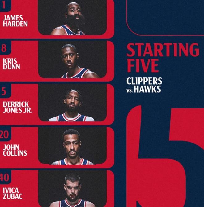 赛前,美媒ESPN预测了本场比赛的最新胜率,快船胜率为44.8%,老鹰胜率则为55.2%,稍占优势。今日比赛,首发阵容方面,快船队这边,伦纳德和比尔均缺战,主帅泰伦-卢排出的最新首发五人组为:詹姆斯-哈登、克里斯-邓恩、小德里克-琼斯、约翰-科林斯和伊维察-祖巴茨;老鹰队这边,波尔津吉斯迎来复出,首发阵容则为:戴森-丹尼尔斯、基顿-华莱士、扎卡里-里萨谢、杰伦-约翰逊和克里斯塔普斯-波尔津吉斯。